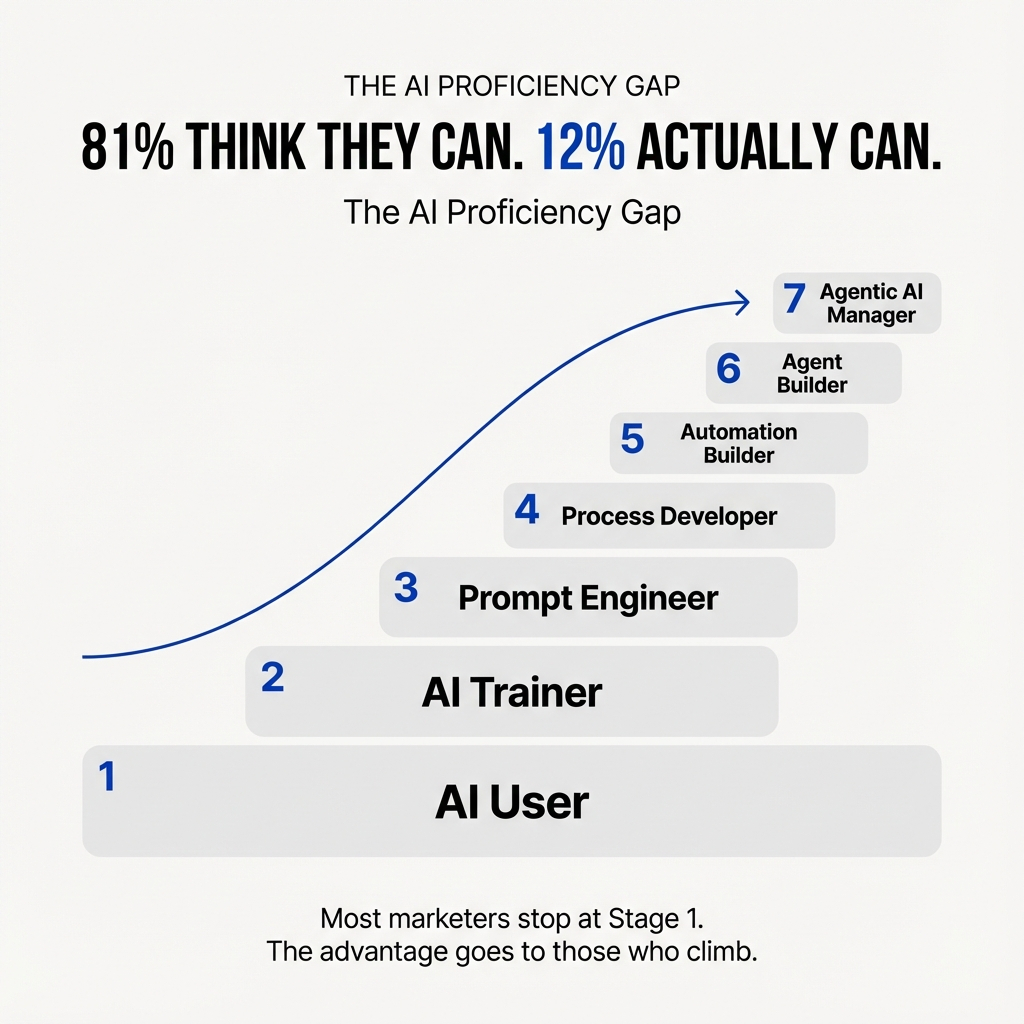 81% of professionals believe they can use AI effectively. Only 12% actually possess the skills to do it well. That gap tells you everything you need to know about where we are right now. The problem is structural, and it reveals itself in how people think about AI proficiency. Most marketers treat AI like a tool you learn once. You figure out ChatGPT, write better prompts, and call it done.